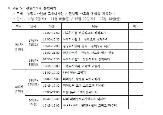 ◦ 모듈 5 : 농장디자인과 그룹디자인 / 전일적 사고와 통합을 체득하기